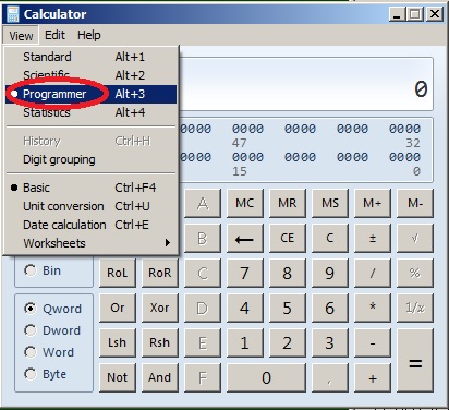( CALC.EXE ) ja määrata talle seaded View-Programmer ja Dec (kümnendsüsteem) ja Qword:
